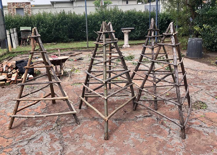 – Handcrafted obelisk trellis. Made from found and donated materials when possible. Perfect for climbing plants, beans, and berries.