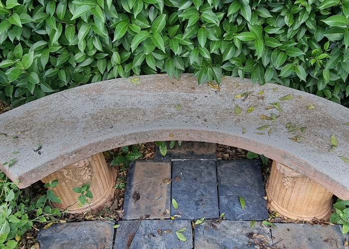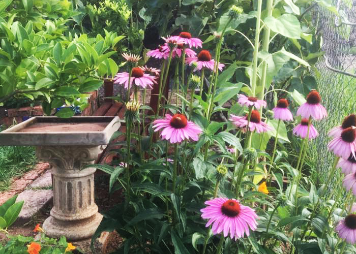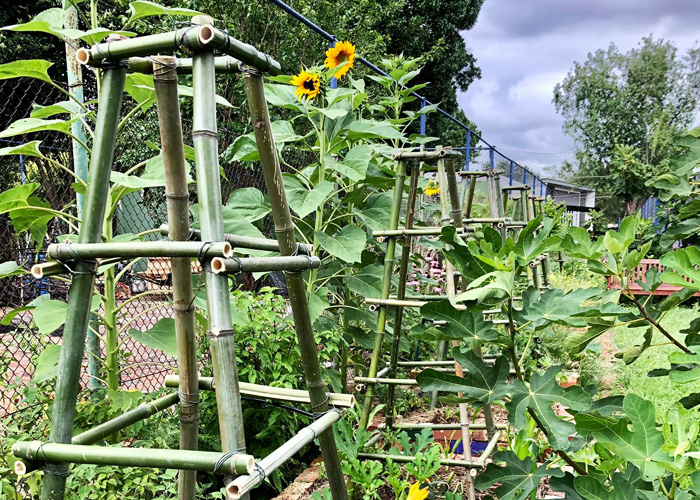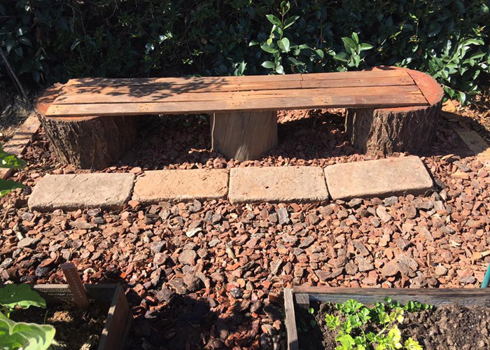 This little bench is tucked away behind our planters, nestled between flowering herbs, wormwood, and clover. It’s a symbolic structure that has morphed over time depending on the season and materials available. As always found, donated, and upcycled materials enable us to get creative in our problem solving.