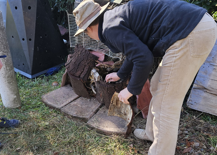 A day in the winter sun, in the presence of good company, beautiful winter textures, the sound of water against drying leaves and the earthy smells of decomposing compost. Even though much of our garden rests in winter, our compost continues to decompose itself, feed our fallow veggie beds and enable us to maintain our garden in the quieter months. We are also testing a leaf mould bin out and the layering that is happening is a treat to observe, as is marvelling at the more than six connected hosepipes we use maintain our compost and leaf bins.